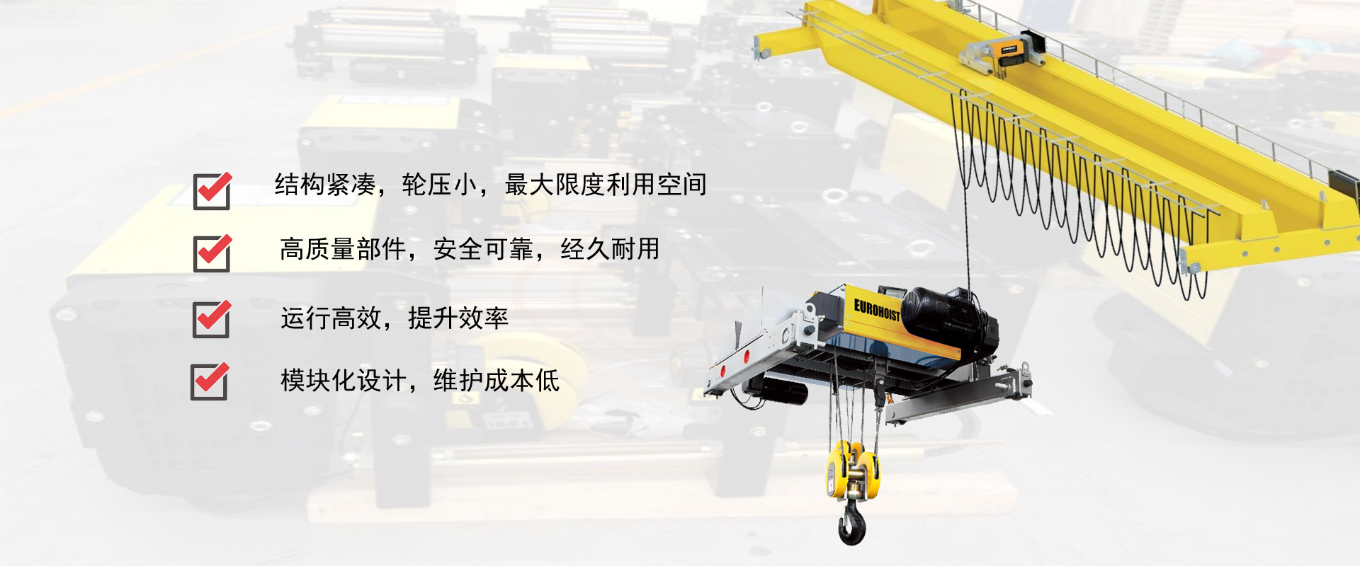 密歇爾起重機(jī)械(杭州)有限公司提供全面的起重輸送產(chǎn)品和服務(wù),產(chǎn)品覆蓋環(huán)鏈電動(dòng)葫蘆(125Kg-80T),歐式鋼絲繩葫蘆,防爆葫蘆,懸臂吊,KBK柔性起重機(jī),歐式起重機(jī),起重馬達(dá),端梁,起重移動(dòng)供電系統(tǒng)等,在國(guó)內(nèi)外被廣泛的應(yīng)用于生產(chǎn)車(chē)間,汽車(chē),模具,機(jī)械制造,鐵路,船舶,物流搬運(yùn),現(xiàn)代化工廠流水線等工業(yè)及其它特殊用途。